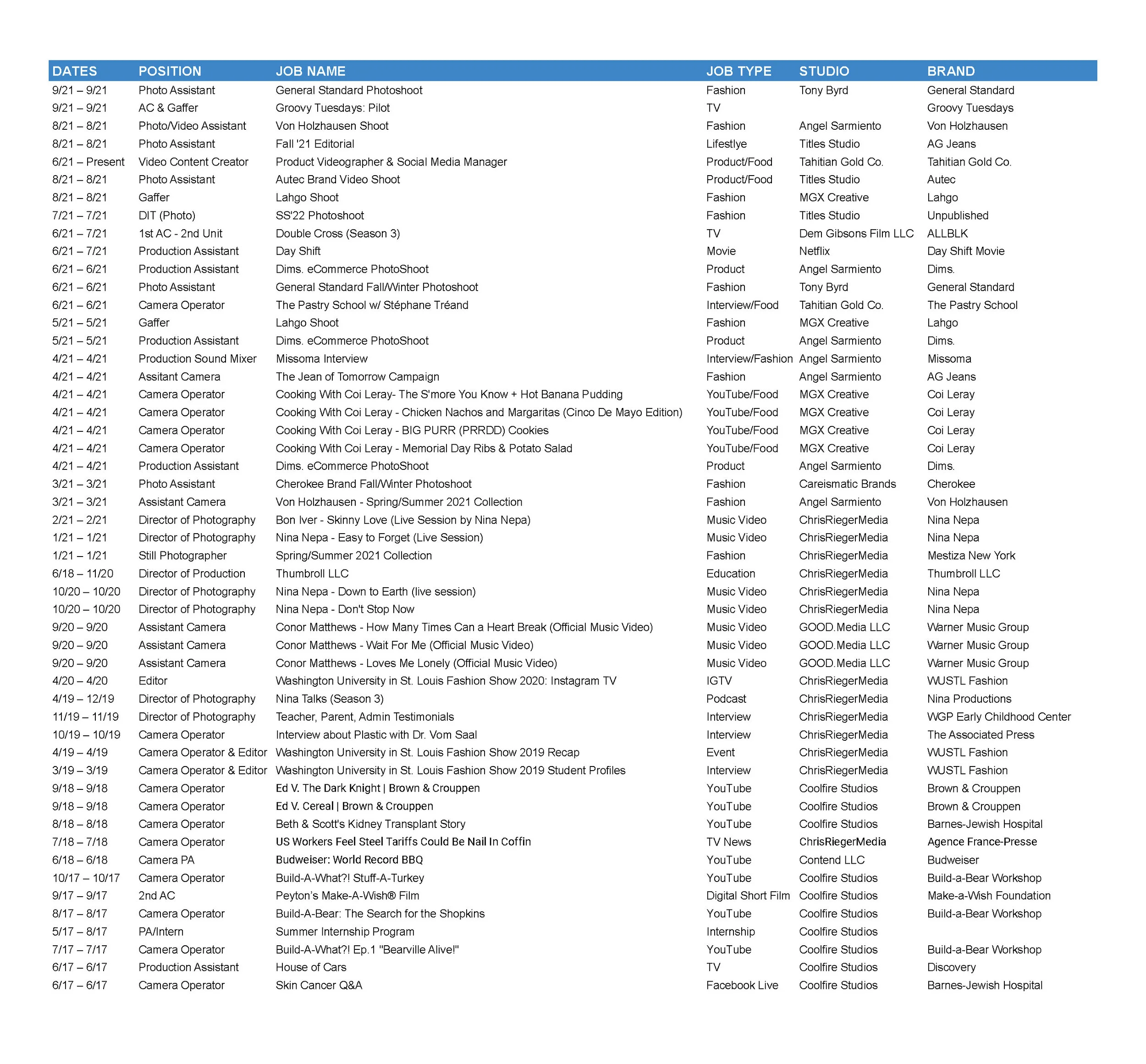Check out my list of credits below, or follow this link to my Google Sheet to my most up to date credits.